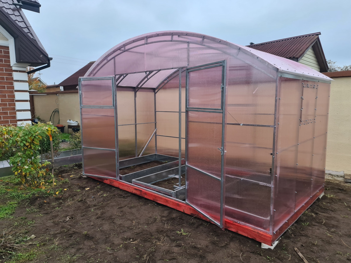 • широкая 4 м, ширина теплицы позволяет организовать 3 широкие полноценные грядки с комфортными проходами между ними;